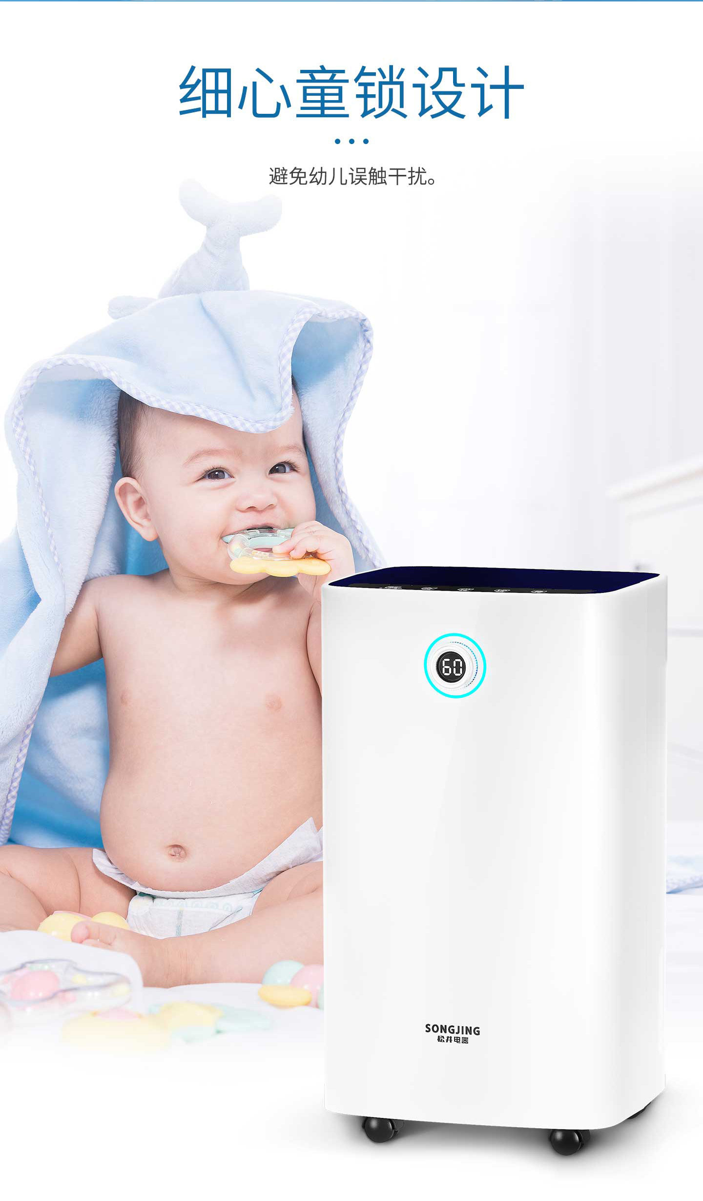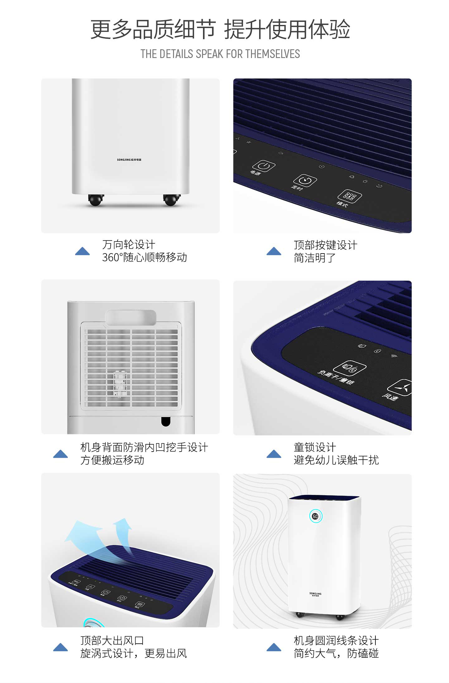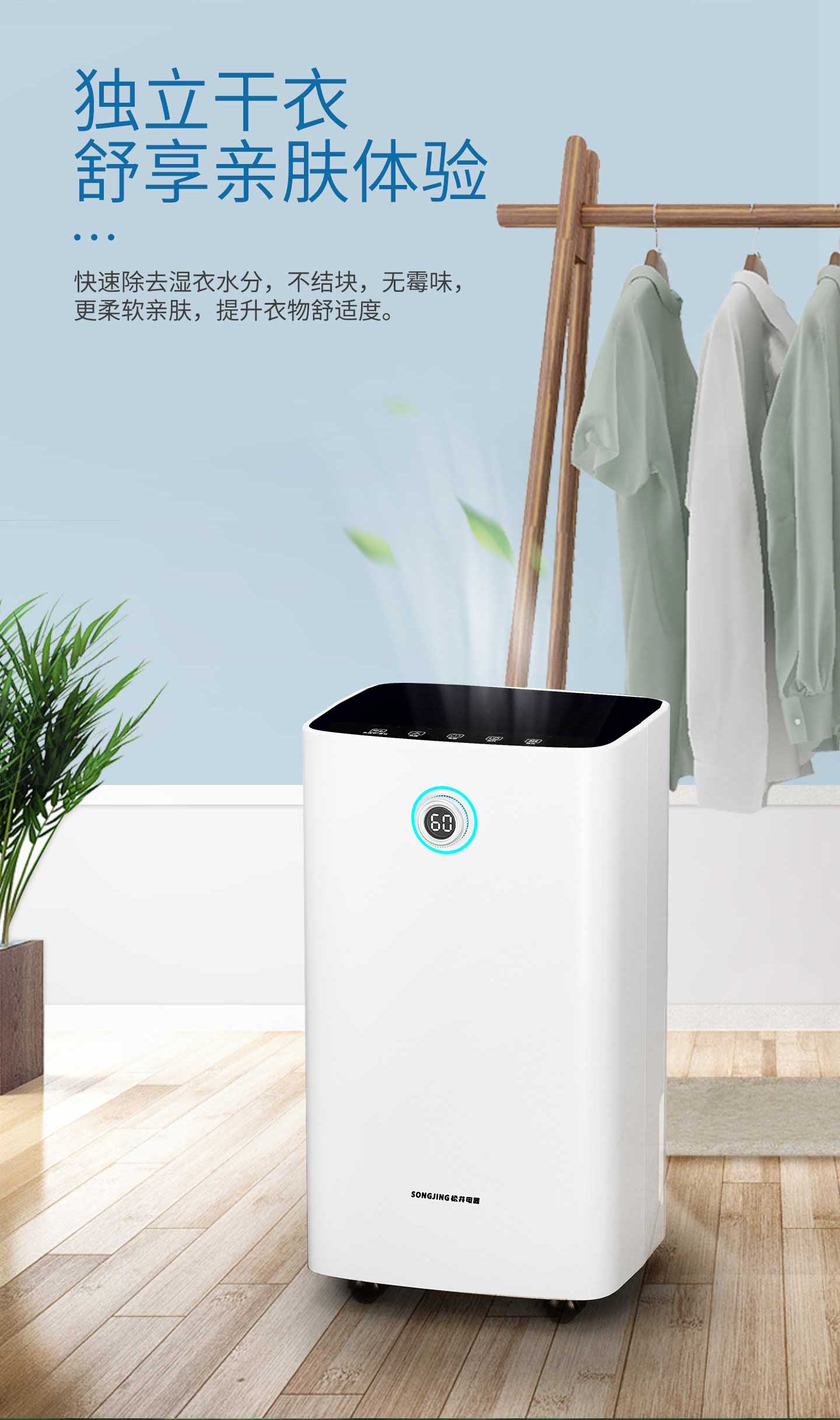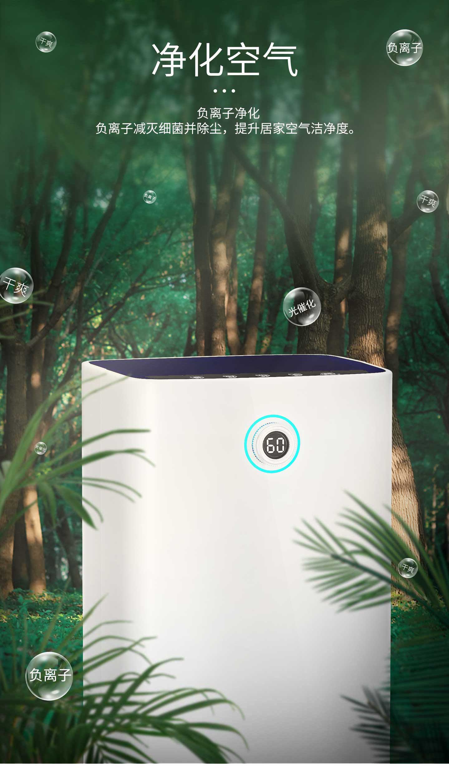·強勁除濕·獨立干衣·凈化空氣·負(fù)離子凈化·輕奢鋁制旋鈕調(diào)節(jié)·三色燈環(huán)設(shè)計·LED濕度顯示·功能按鍵·萬向輪移動·童鎖設(shè)計·定時功能·睡眠模式