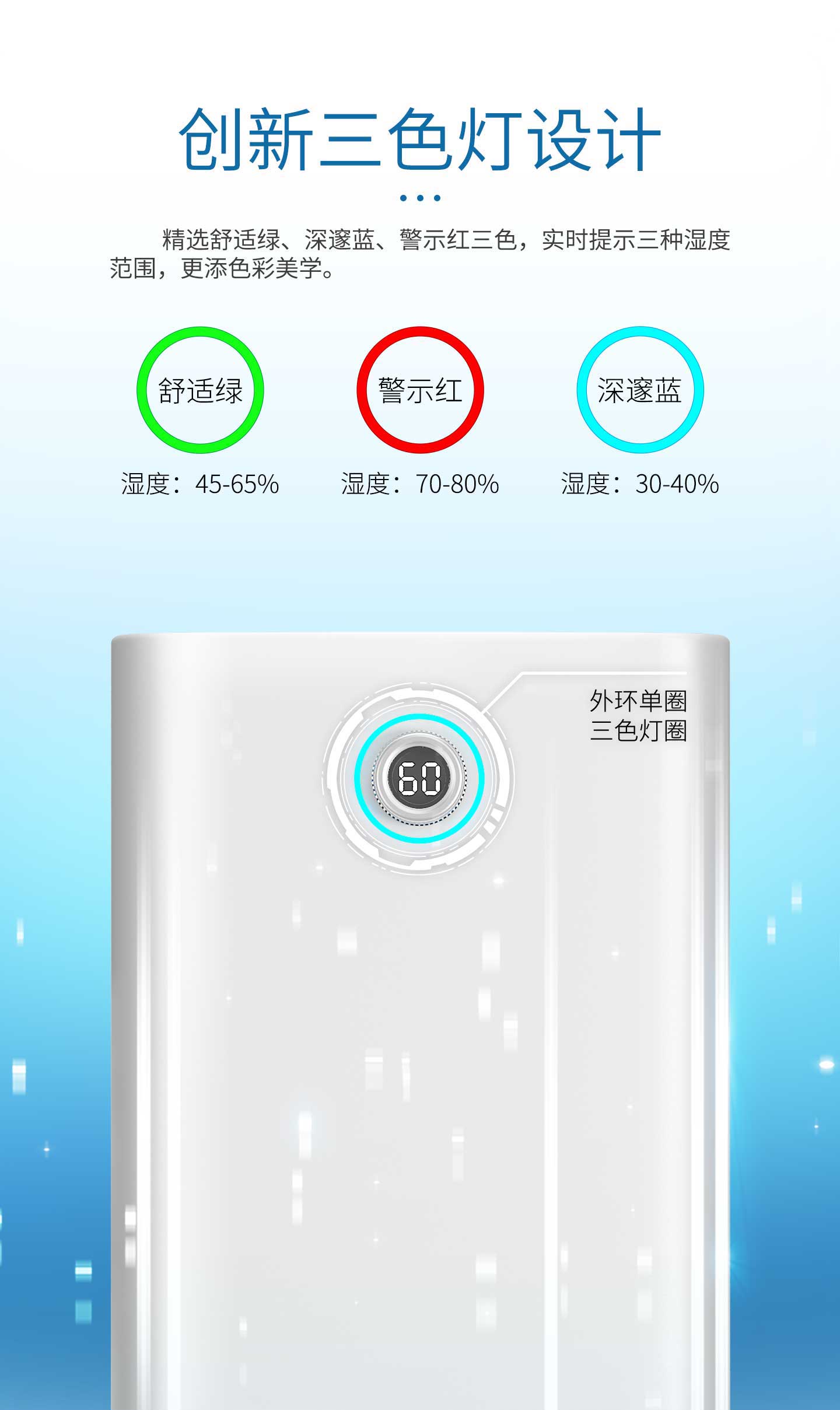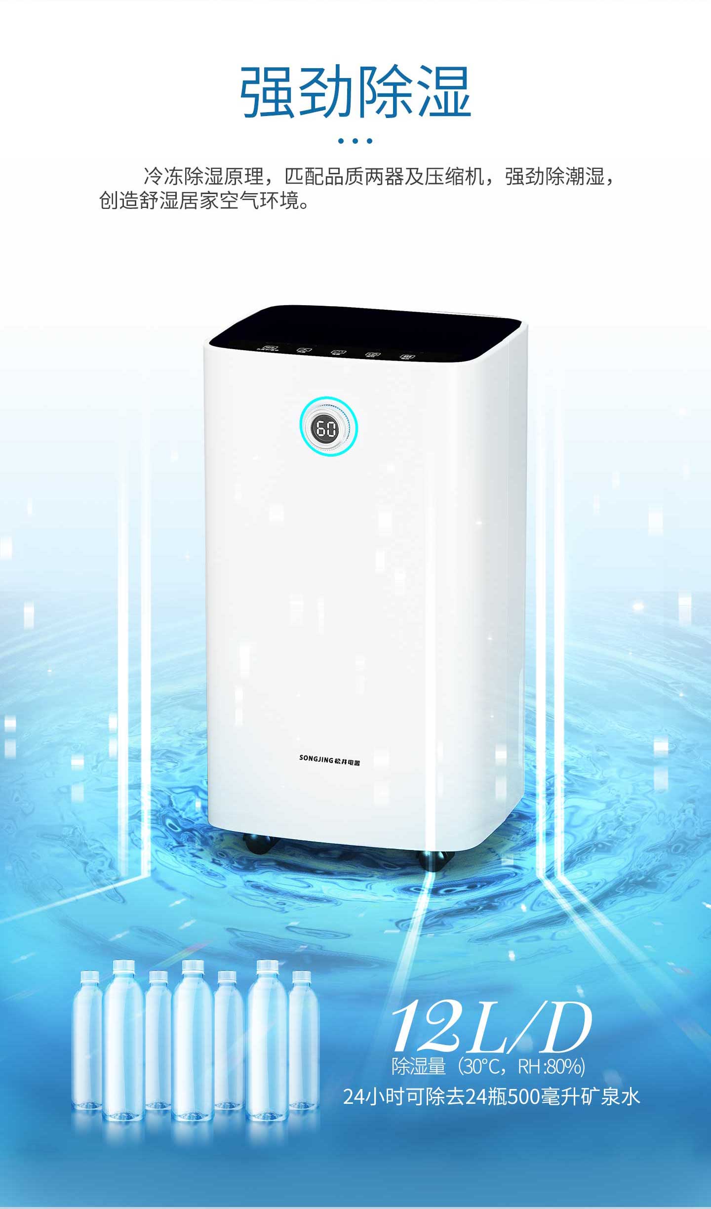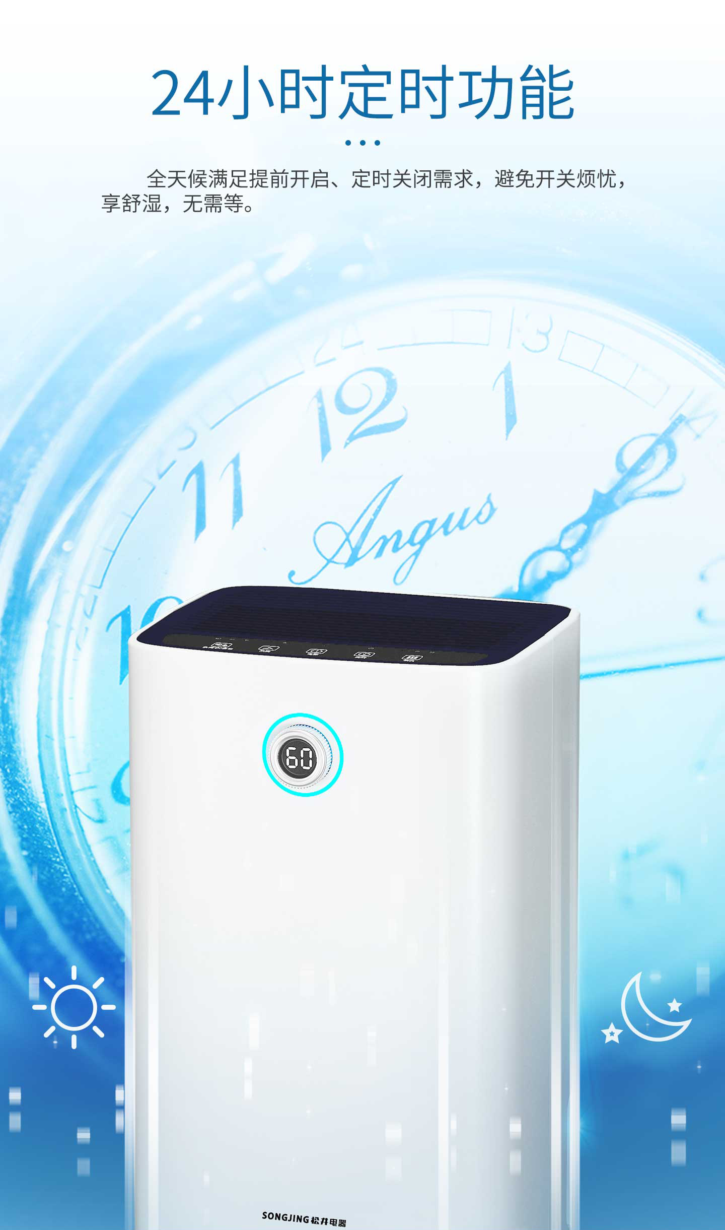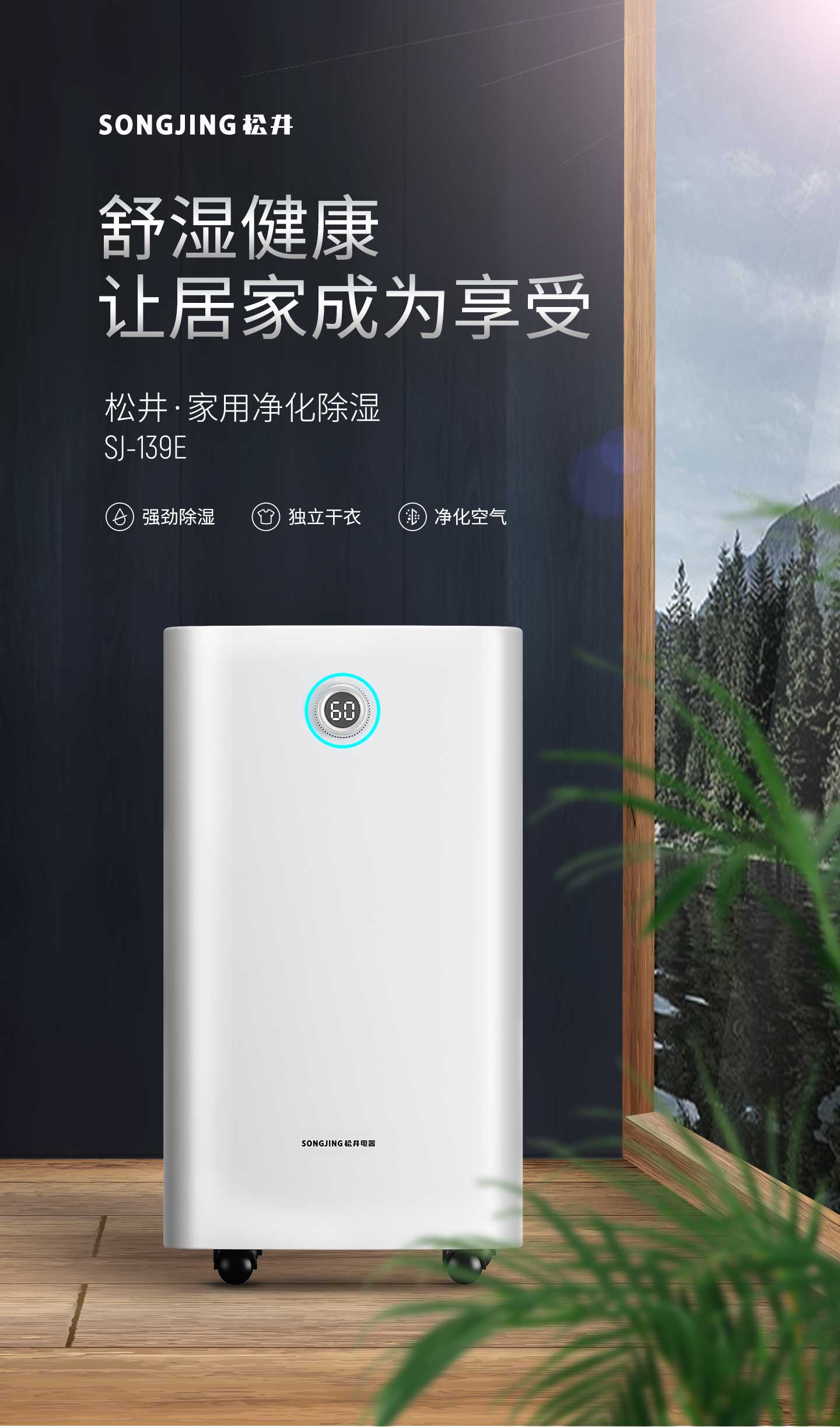 ·強勁除濕·獨立干衣·凈化空氣·負(fù)離子凈化·輕奢鋁制旋鈕調(diào)節(jié)·三色燈環(huán)設(shè)計·LED濕度顯示·功能按鍵·萬向輪移動·童鎖設(shè)計·定時功能·睡眠模式
