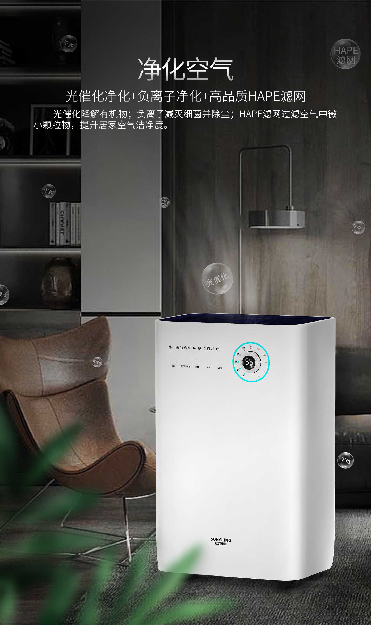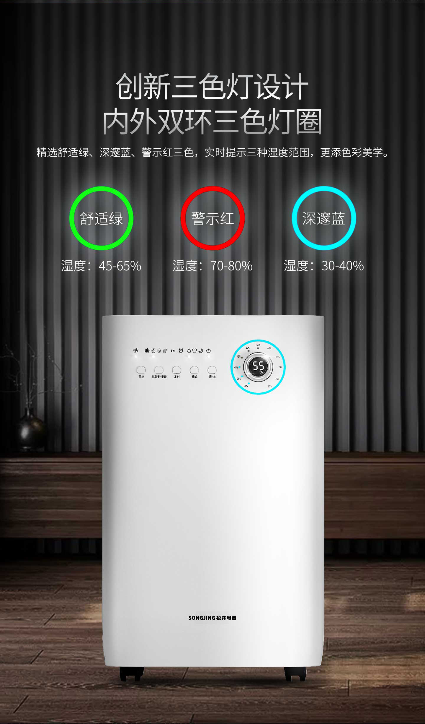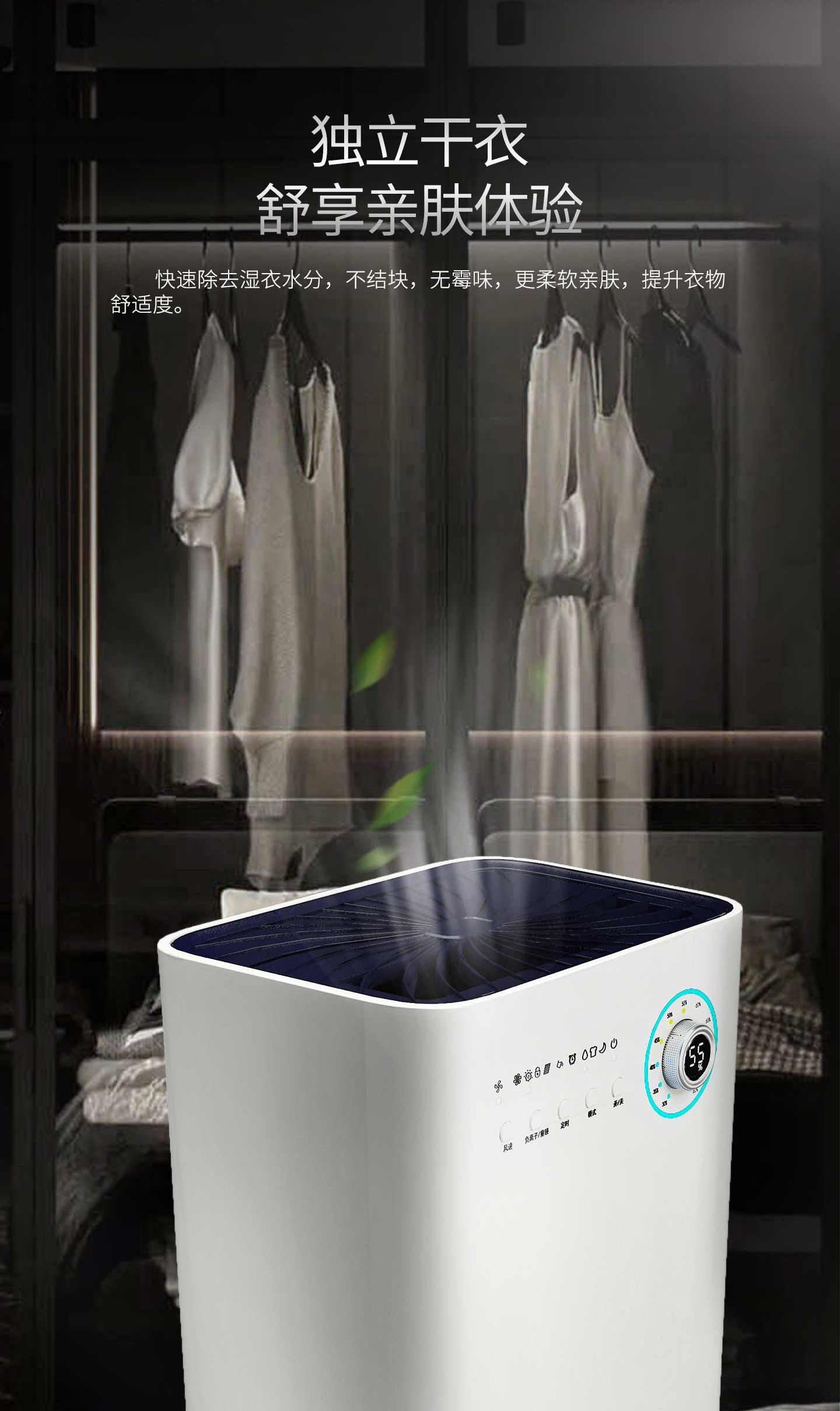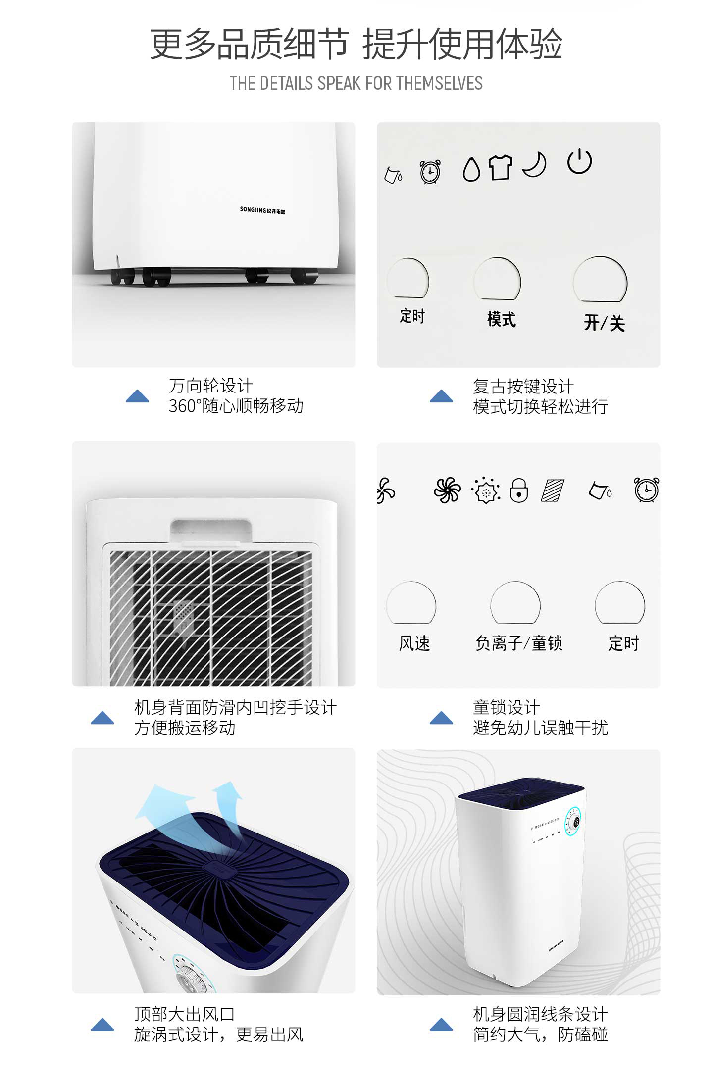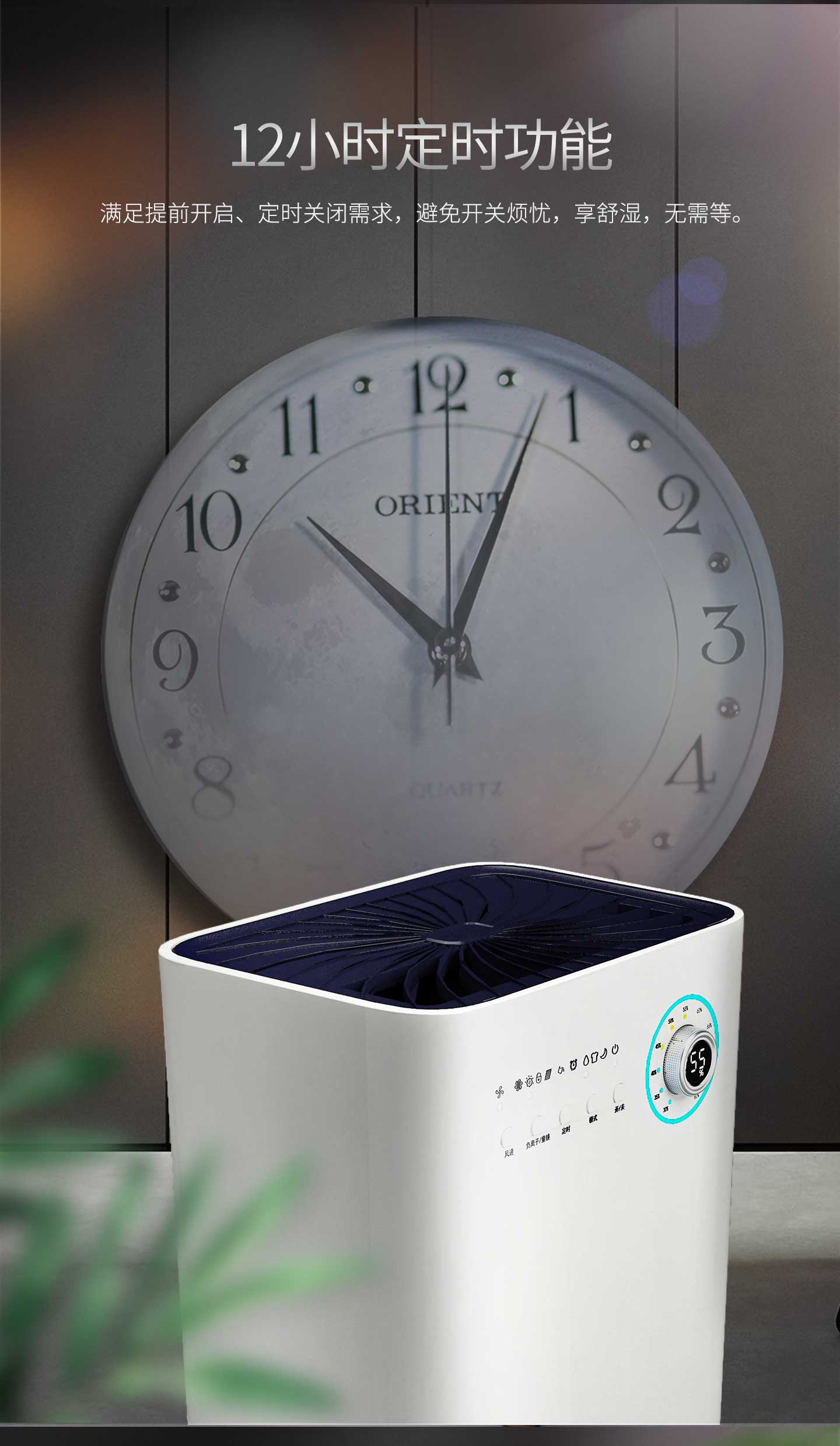 ·強勁除濕·獨立干衣·H12級HEPA濾網·負離子凈化·光催化凈化·輕奢鋁制旋鈕調節(jié)·三色燈環(huán)設計·LED濕度顯示·功能按鍵·萬向輪移動·童鎖設計·定時功能·睡眠模式