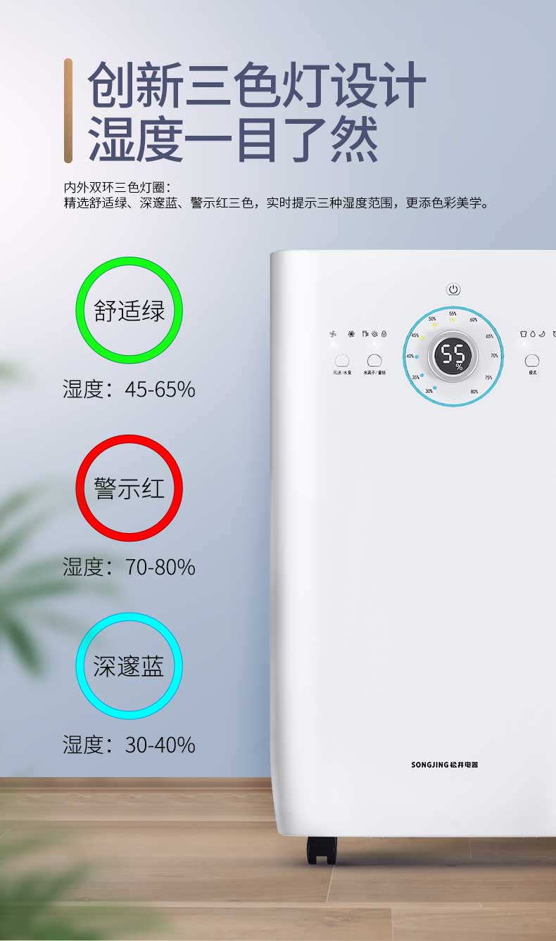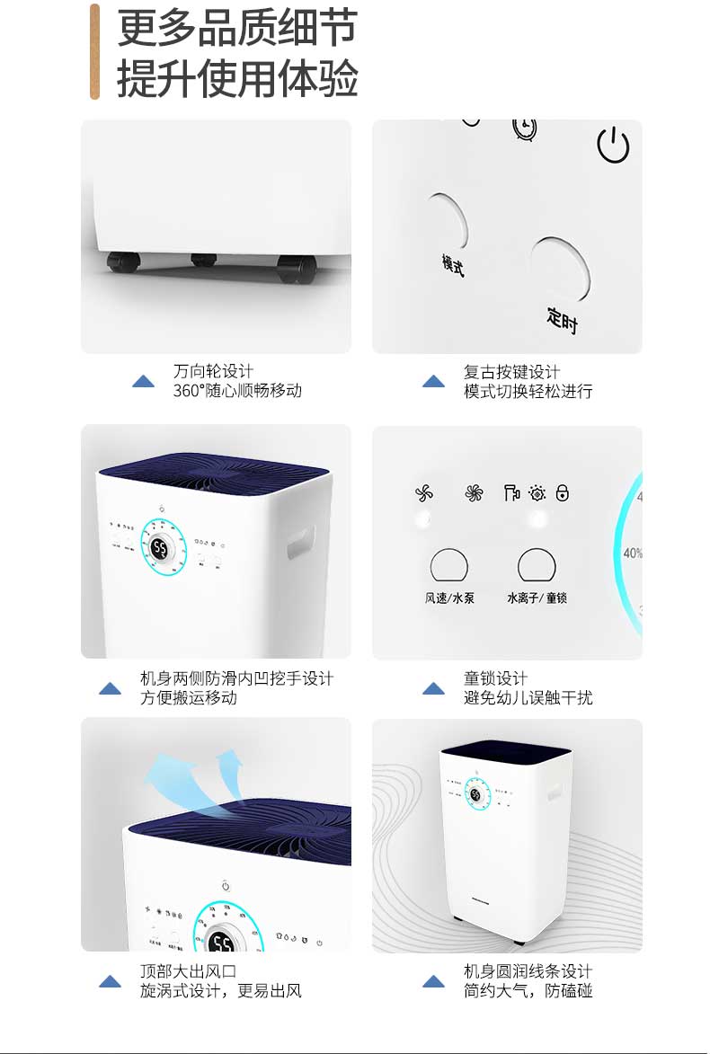 ·強(qiáng)勁除濕·獨(dú)立干衣·H12級(jí)HEPA濾網(wǎng)·納米負(fù)離子凈化·光催化凈化·輕奢鋁制旋鈕調(diào)節(jié)·三色燈環(huán)設(shè)計(jì)·LED濕度顯示·功能按鍵·萬(wàn)向輪移動(dòng)·童鎖設(shè)計(jì)·定時(shí)功能·睡眠模式